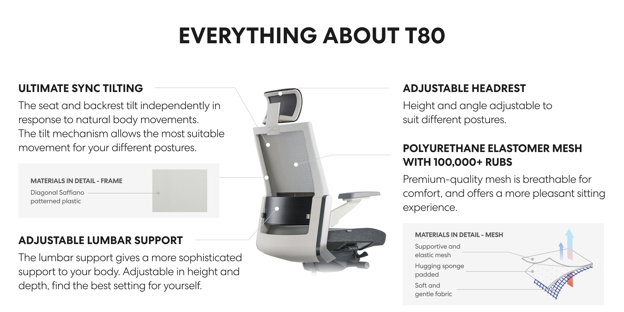 [FOR HOME, OFFICE AND GAMING] T80 is highly customizable. With its high adjustability, T80 is good for home, office, and game chair environments. Make this ergonomic chair follow your every movement so it can ergonomically support you
