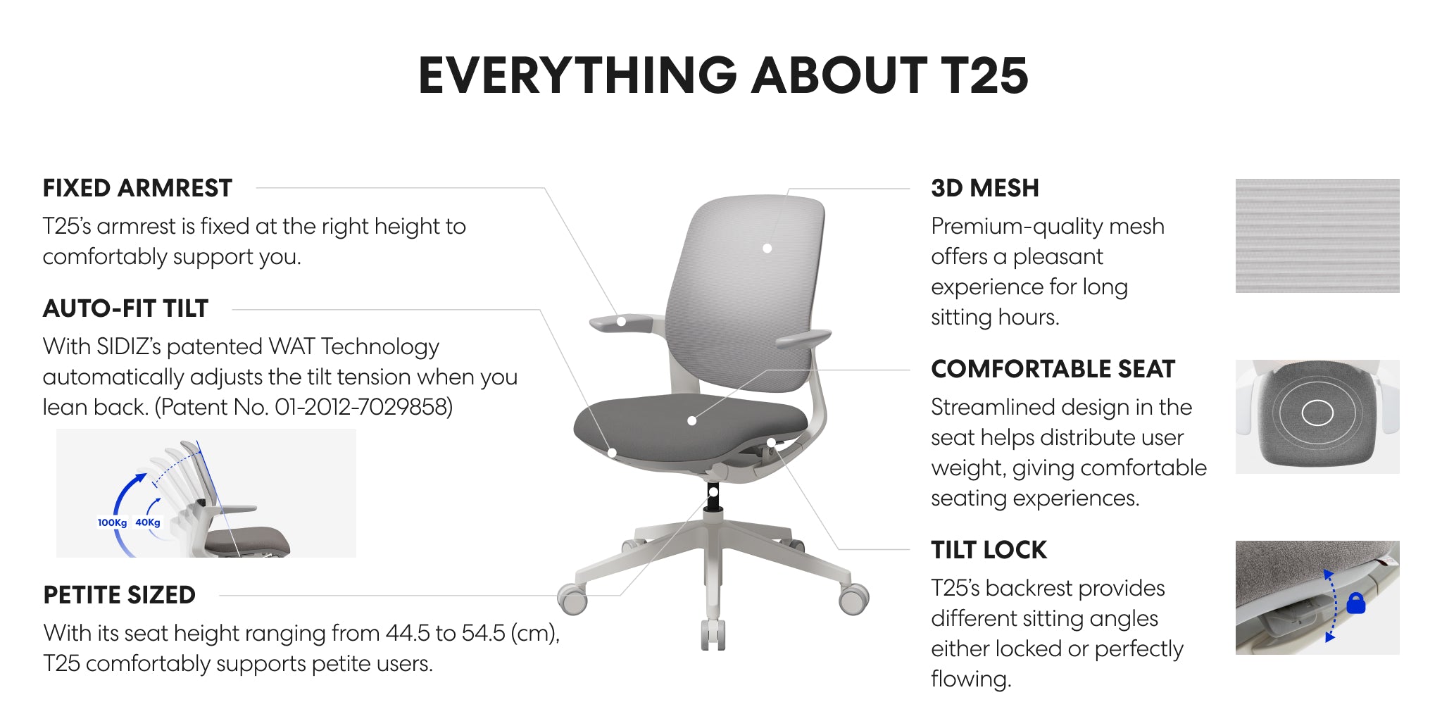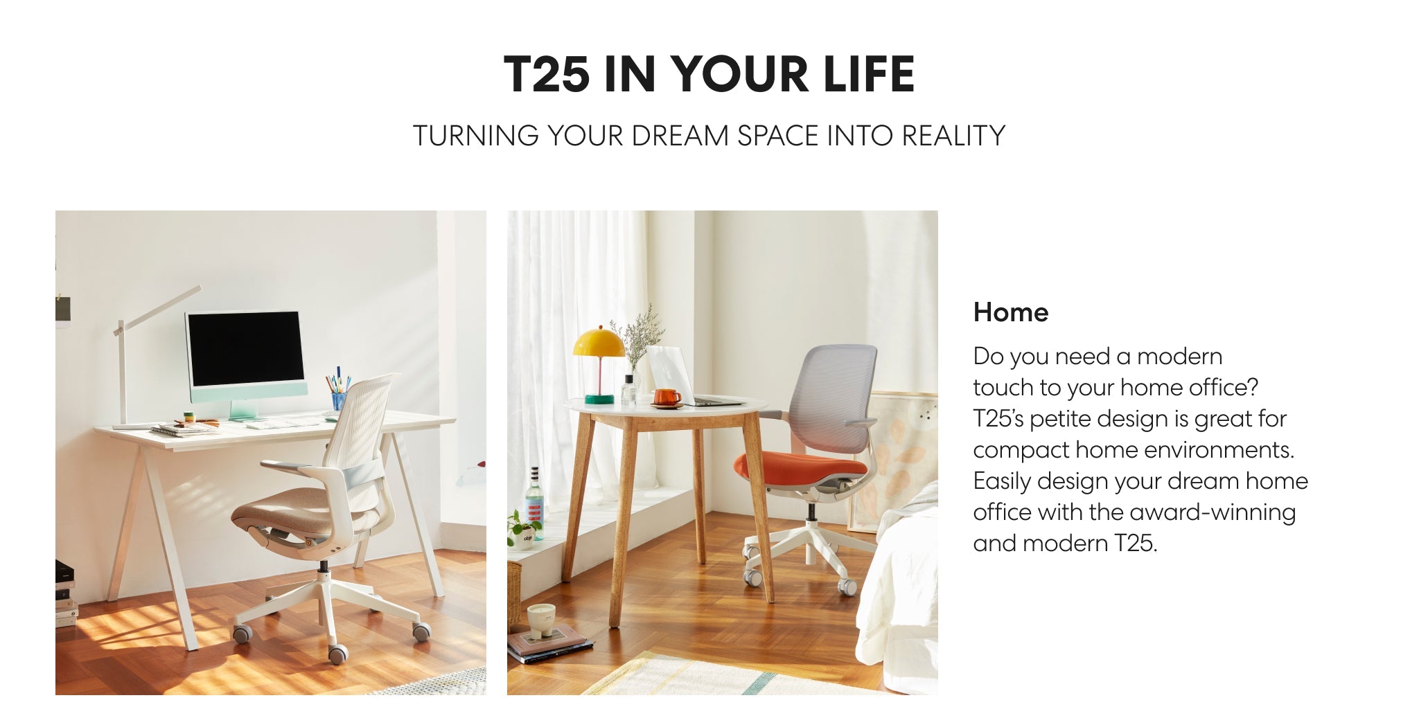 [DIMINUTIVE DELIGHT] T25 stands as a testament to the perfect blend of style and functionality. Specifically designed for petite people 4' 9'' or over, the compact design provides exceptional comfort. If you are seeking for the perfect home office chair fit, T25's ergonomic excellence is bound to enhance your productivity.
